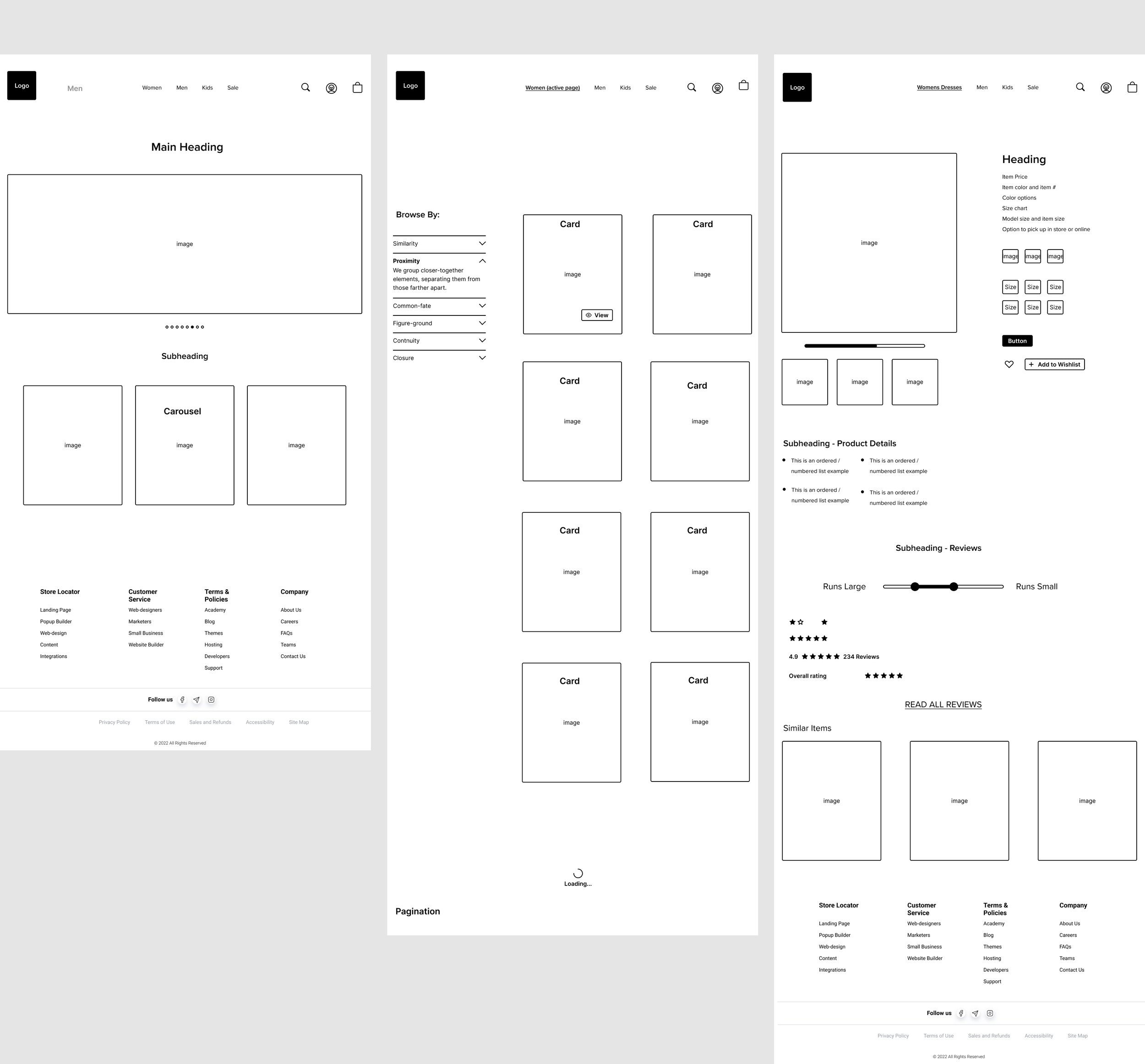 Wireframes based on previous iterations focusing on desktop design. Landing Page, Category Page, Product Page.